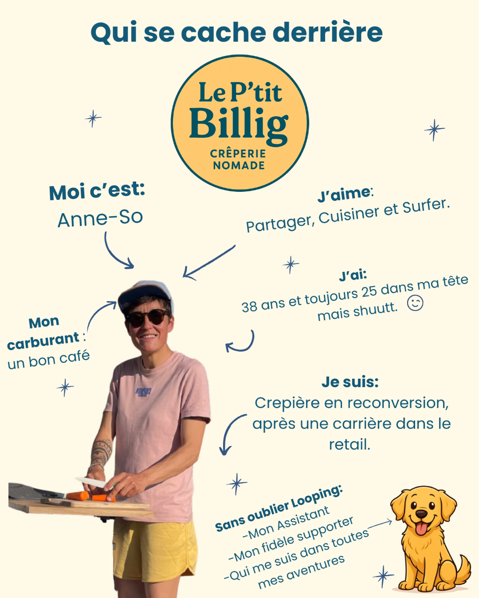 Derrière Le P’tit Billig, il y a Anne-Sophie. 38 ans sur le papier, 25 ans dans la tête (mais chut 🤫), Bretonne jusqu’au bout du beurre salé et animée par une énergie communicative. Passionnée de sport et de cuisine, elle incarne cette nouvelle génération d’entrepreneurs qui osent se lancer avec enthousiasme, après un solide parcours professionnel.